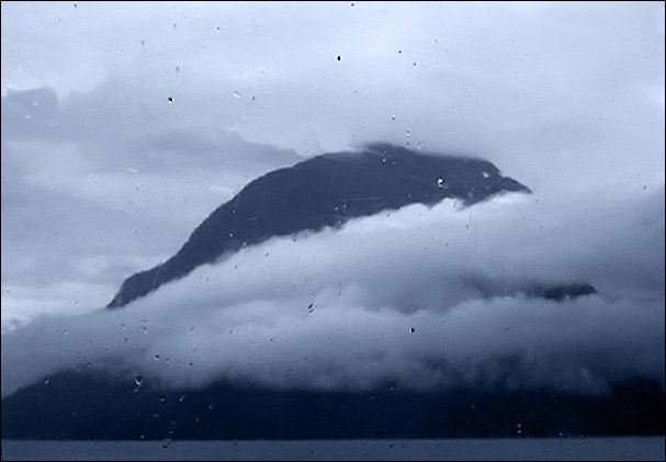we see the top of the mountain surrounded by low lying clouds in the rain