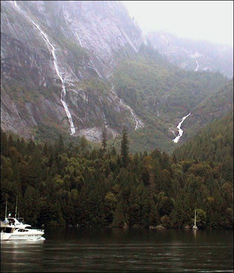 Some of the taller mountains with a long waterfall that falls into the forest at the bottom of the mountain.