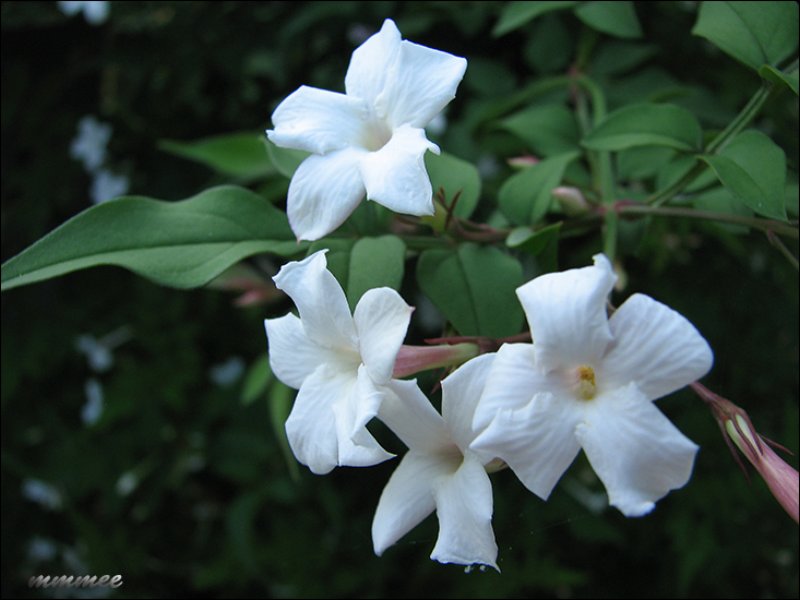 The pure white blosoms of the jasmine on the dark background work very well in black and white.