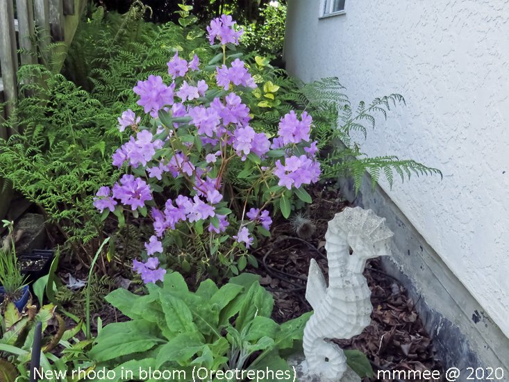 The sea horse, ferns between the steps to the deck and the house. Since 2018 this little area has had a lovely rhodo with bluish leaves that is growing up to screen the patio view from across under the deck where the nefarious neighbors have trashed the cedar hedge. This is a nice cool spot to sit. We don't get the stink of the smoke from the nefarious neighbors here.