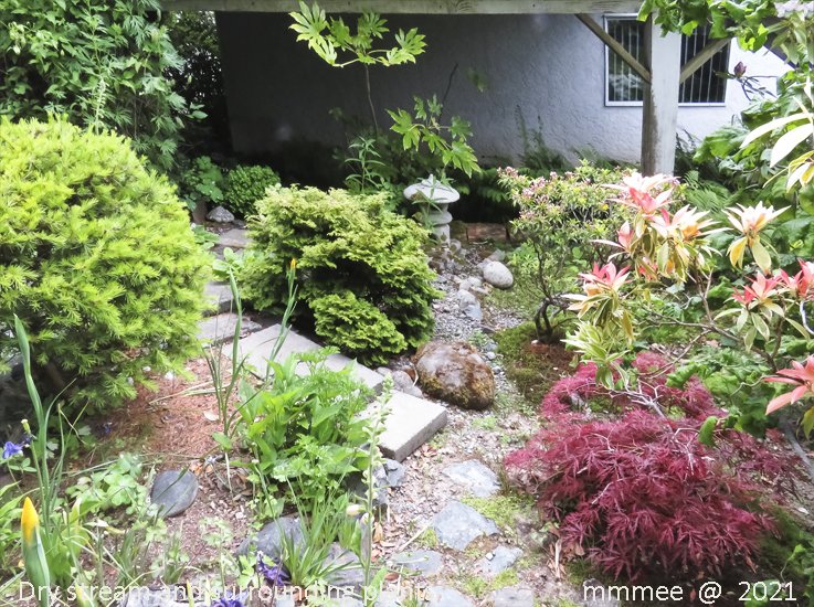 The mountain laurel and the red Japanese maple in 2022. The dry stream is overgrown with moss and weeds.