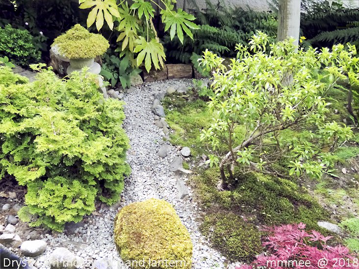 A view of the drystream in 2021. The lantern and the big mossy rock have lost their moss.