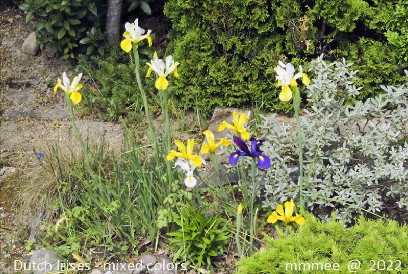 The tall dutch irises (mixed colors) growing in the old plum tree stump area of the water garden room in 2021. I should have a nice mix of colors to move when renovating. I could use some of these irises in the cutting garden, also.