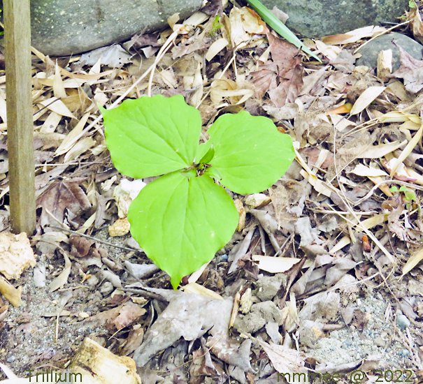 Trillium erectum purple – native height 20 – 30 cm. similiar to erectum but more purple color transplanted in a pot, as this is the stinking trillium. It is now with the rest of the trilliums, under the Magnolia tree.