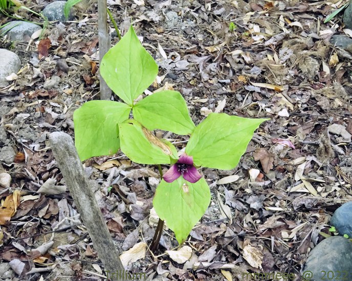 Trillium ovatum - I believe I have 2 of these plants, both in the Magnolia bed. One is older and as at May 2019 it has had 3 blossoms. WESTERN Trillium. Stem erect, lower stem bare. Leaves 2–8 in. long, linear to widely egg-shaped, with pointed tip. Flowers on 1–2 1/2 in., erect to weak stalk above leaves. Sepals green, lance-shaped. Petals 1/2–3 in. long, oval with pointed tip, white fading to pink or deep rose-red.
