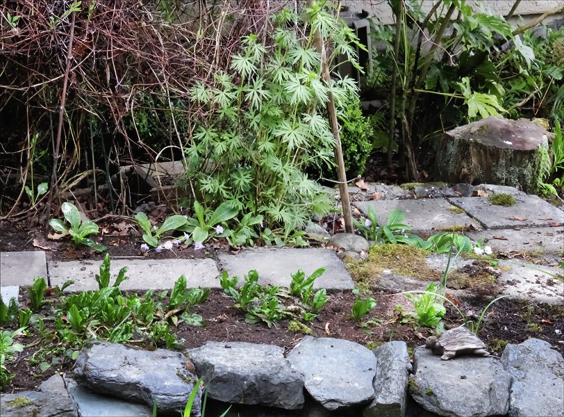 The clematis and the delphinium grow by the post next to the cedar hedge.