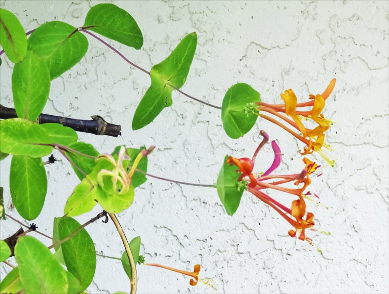 HONEYSUCKLE VINE (Lonicera sempervirens) grows up its trellis from in the tall white pot that sits on