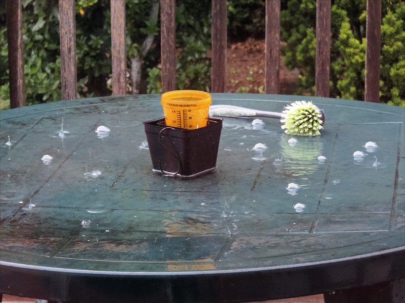 Photo of August, 2017, showing the old bamboo trellis on the tall white pot for the honeysuckle vine.