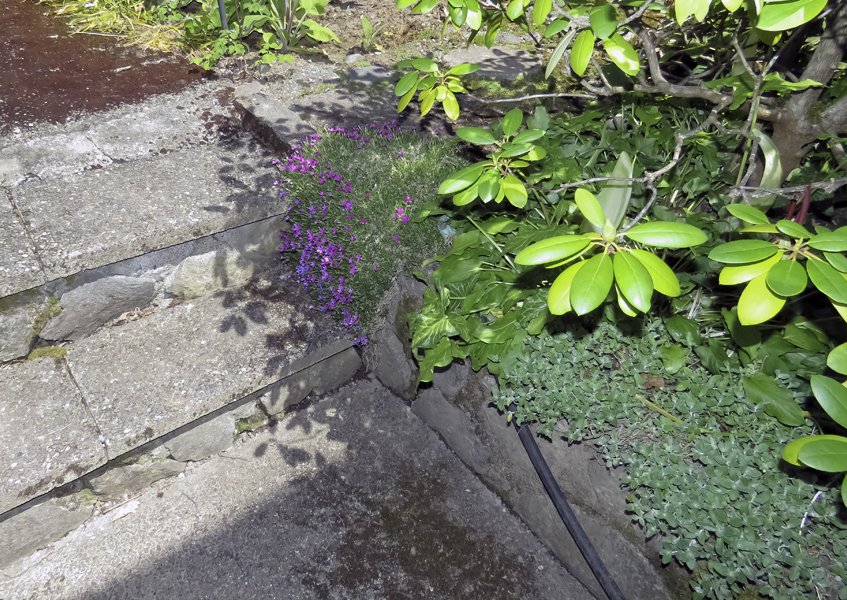 Photo of March 2024 on the other side of the steps, showing the blue veronica hanging over