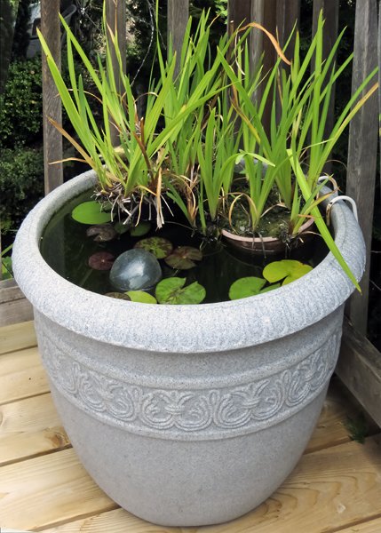 The water tub with irises and the mini water lily in August of 2022. The globe flower in its pot seems to be