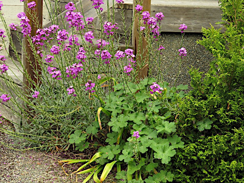 photo of May 24, 2020 of the wallflower, blue geranium and cedar by the steps and railing up to the entryway and door.