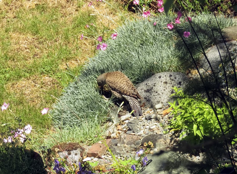 A Flicker perched on a pipe on the neighbour's house.