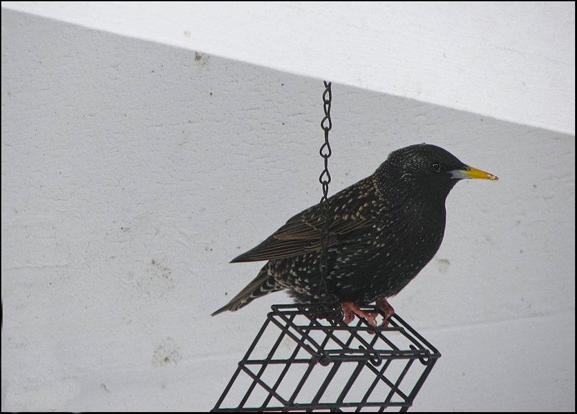 a starling at the feeder. Since this is a winter time photo, (November) the starlings do not have their color tints to their feathers - just white spots on the black.