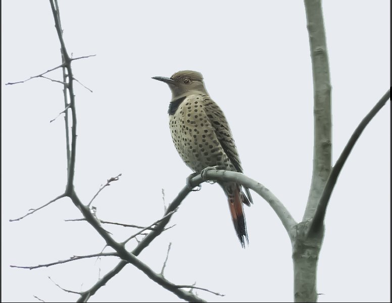 The Flicker high up in the cedars in the back garden. This is a very colorful, beautiful bird.