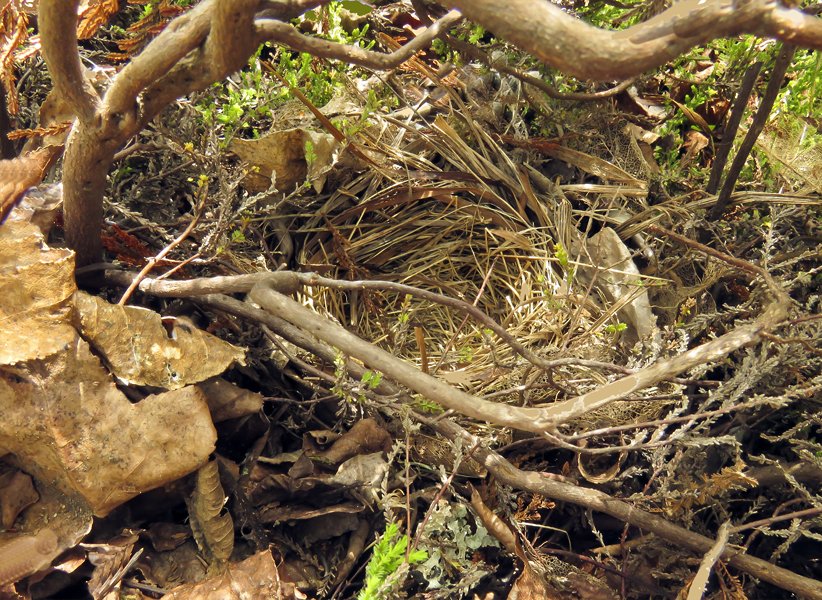 A nestfull of spotted towhees on May 3, 2017. The nest is next to the little boxwood hedge under a heather.