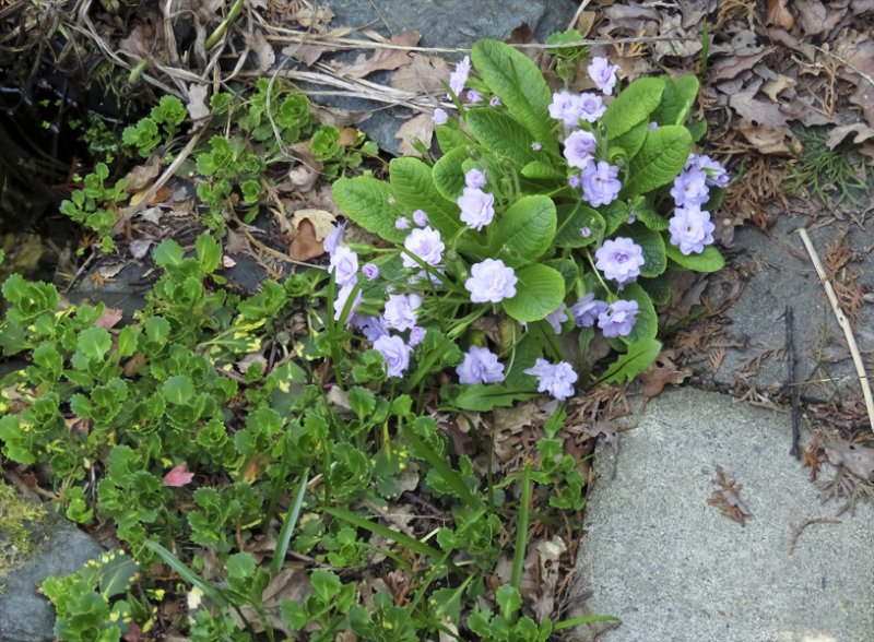 photo of April 23, 2021 showing the cement pavers path with polyanthus and some of the plants from in