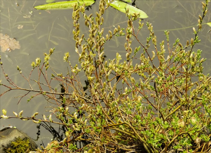 Salix – silver leaves, yellow bark – Probably Salix helvetica. Tough plant, I can prune it to what ever size I want. Grows by the pond with roots in water, at the corner of the pond across from the waterfall, in the "plum tree stump" area. Has pussy willows now at the end of April 2024.