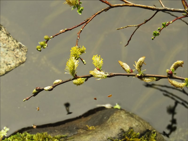 Salix – boyd's pendula – Pond edge with its roots in the water, by the waterfall and across the cement pavers from the YEW and BOXWOOD hedge.